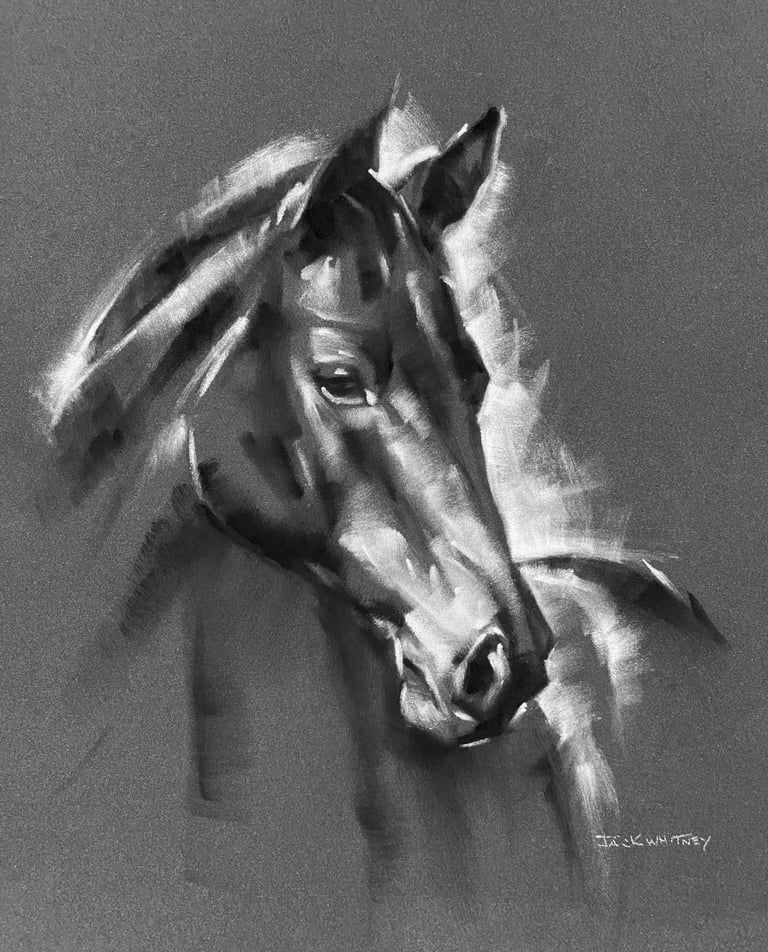 Experience the elegance of equine art with this stunning Panpastel horse portrait, expertly rendered on premium textured paper. The artist skillfully captures the horse’s strength and grace, using dramatic contrasts of light and shadow to bring each detail to life. Perfect for animal lovers and art enthusiasts, this hand-drawn piece complements any décor and makes a unique gift. 9" x 12".