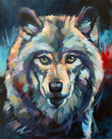Bring your space to life with this stunning colorful wolf portrait painting. Featuring vivid hues of orange, blue, purple, and gold, this eye-catching canvas showcases a majestic wolf rendered in dynamic brush strokes for an energetic and contemporary feel. Perfect for living rooms, offices, or art galleries, its bold design makes it an outstanding focal point and conversation starter. This 11"x14" piece is painted with acrylics on canvas board for lasting vibrancy and impact.