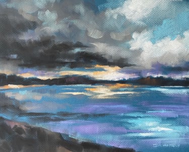 Elevate your space with this stunning abstract lake landscape painting, featuring a tranquil waterscape beneath a captivating, dramatic sky. Expertly rendered in vibrant shades of blue and purple, with soft yellow highlights dancing across the water's surface, each bold brushstroke brings depth and a sense of serene mystery to any room. Perfect for living areas, offices, or creative spaces, this contemporary artwork adds sophistication and calm to your decor. Hand-painted with Panpastels and measuring 12 x 9 inches, this unique piece is ready to be the centerpiece of your collection.