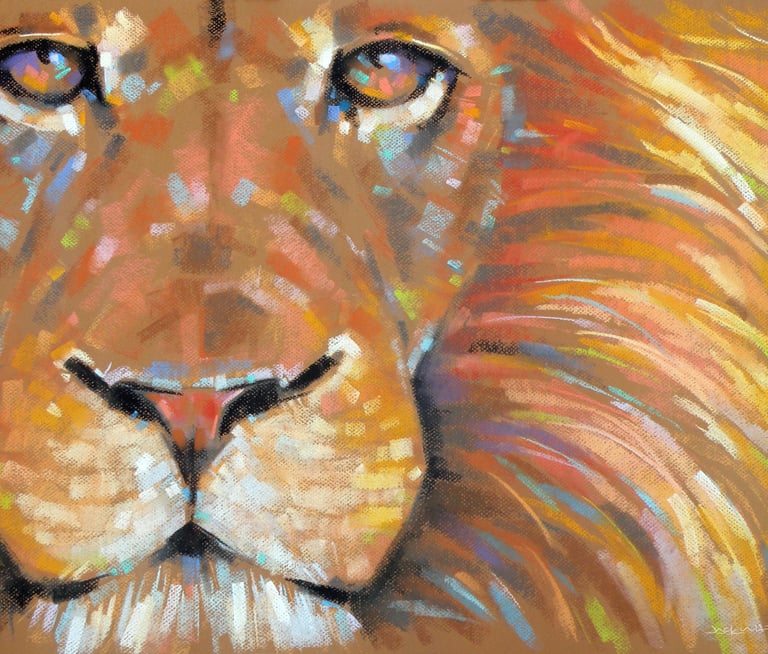Transform your space with this striking vibrant lion pastel portrait, showcasing the majesty and power of the king of the jungle in a stunning close-up. Expertly rendered with expressive brushstrokes and a bold palette of rich golds, fiery oranges, and deep reds, each detail bursts with energy and warmth. This 18"x24" original is perfect as a focal point in your living room, bedroom, or office. Add a touch of wild elegance and let your walls roar with personality.