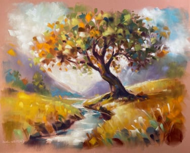 Immerse yourself in the tranquility of nature with this stunning hand-painted landscape artwork. Featuring a majestic tree with rich, verdant branches sheltered beside a gentle stream winding through fields of vibrant golden grass, this impressionist piece radiates serenity and warmth. Expertly crafted with soft pastel strokes and brilliant, harmonious colors, it creates an uplifting accentfor any home or office. Measuring 12" x 9", this one-of-a-kind painting is perfect for adding a touch of elegance and natural beauty to your space. Ideal as a thoughtful gift or a statement piece for your decor.